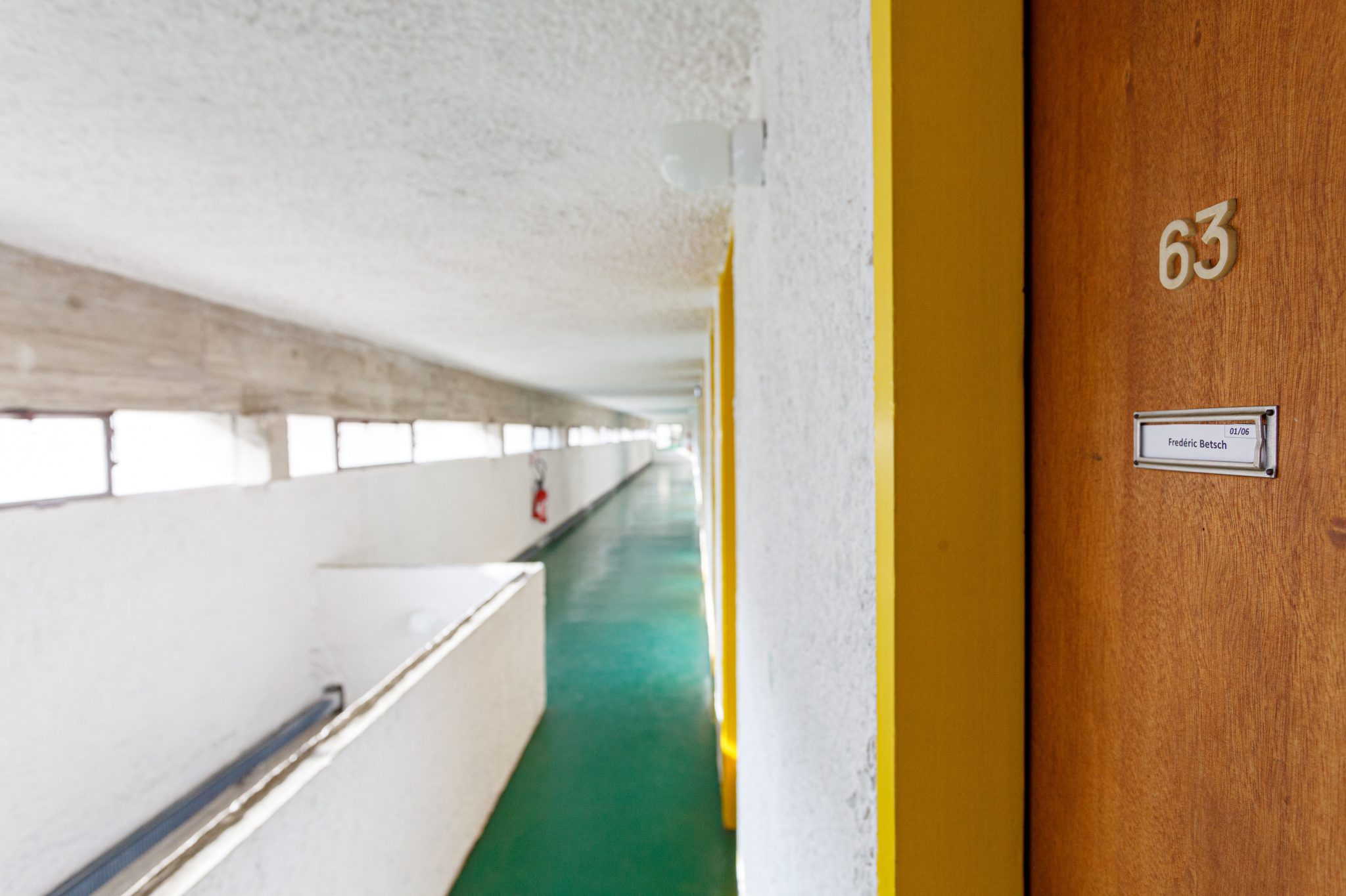 la création harmonique des « pans de verre ondulatoires », vitrages verticaux sertis dans des panneaux géométriques (en claustra) de béton