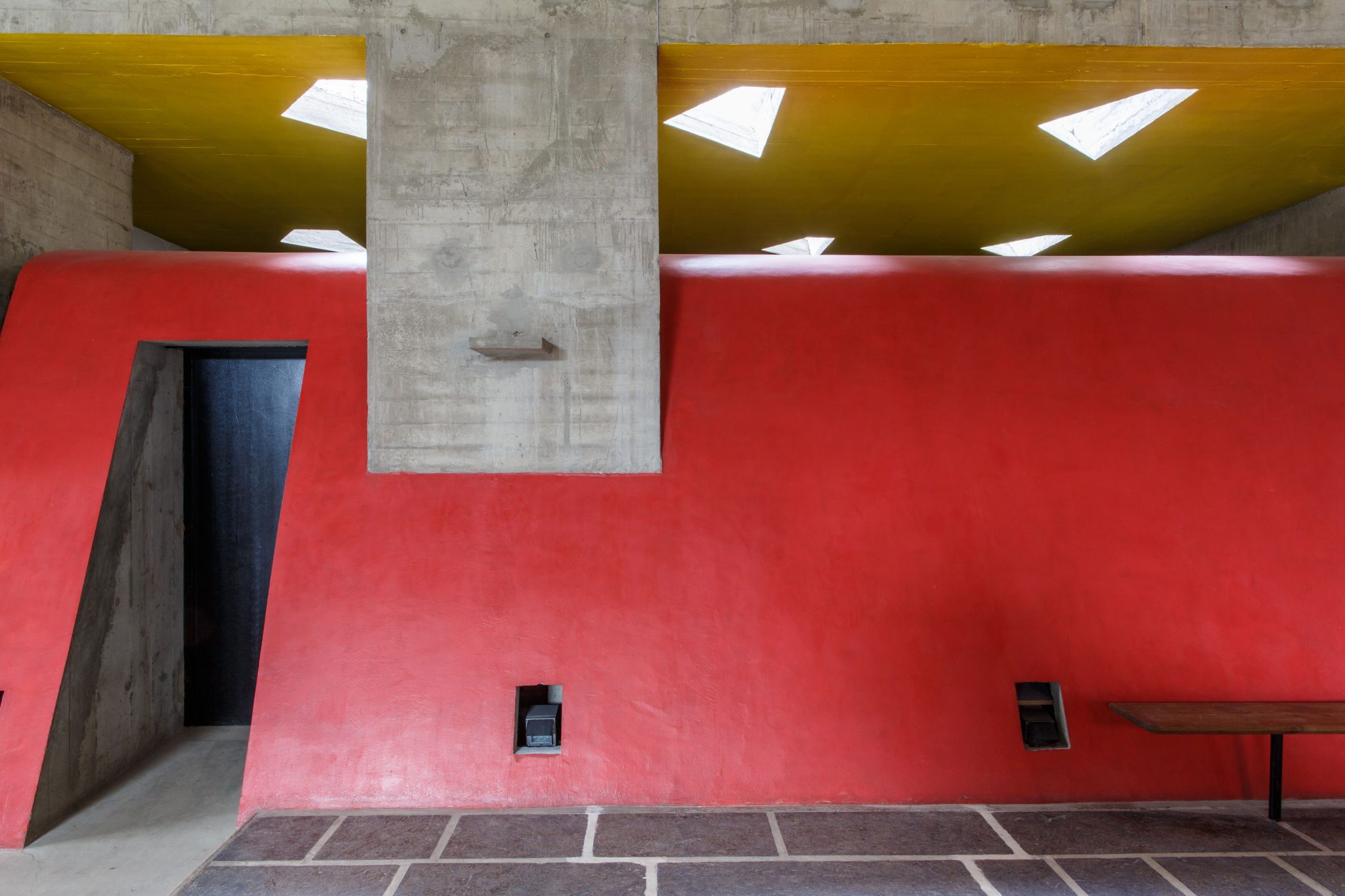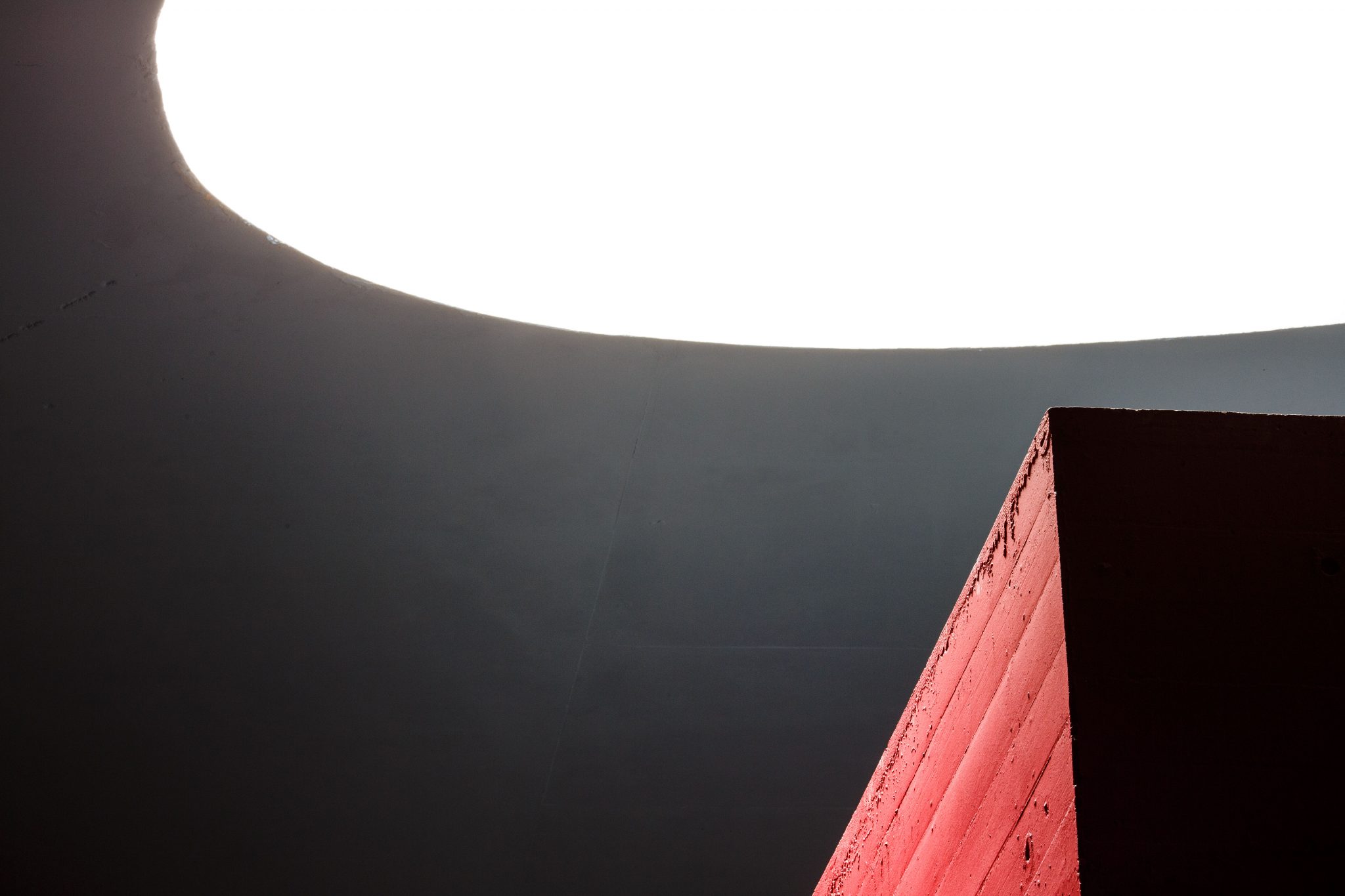 Détail de l'église du Couvent de la Tourette. Une croix en métal sur un mur de béton brut peint en rouge et le puit de lumière blanc